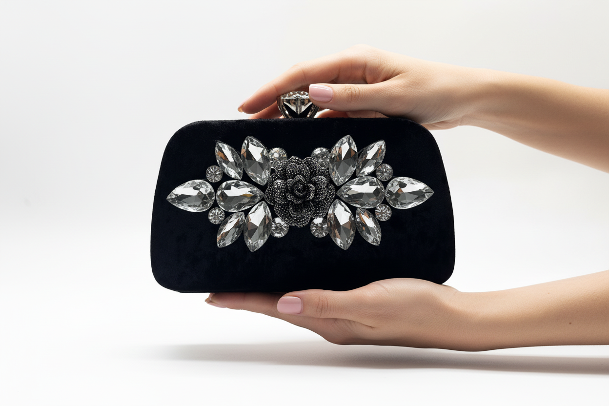 velvet fabric with a rhinestone bouquet from the front